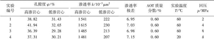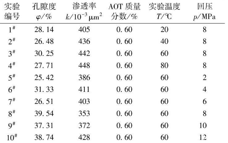 主要實驗材料:選用2-(2-乙基己基)-磺酸琥珀酸鈉(AOT)為表面活性劑;實驗用CO2純度為99.9%;實驗用水為蒸餾水;實驗巖心為填砂管模型,規(guī)格參數(shù):600 mm×Φ25 mm。表1、2所給出的回壓值即為巖心中流體所處的最低壓力,只有高于該回壓值,流體才可以流動。