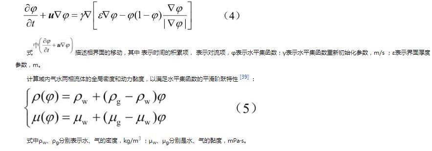 式描述相界面的移動,其中表示時間的積累項,表示對流項,φ表示水平集函數(shù);γ表示水平集函數(shù)重新初始化參數(shù),m/s;ε表示界面厚度參數(shù),m。