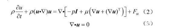 式中ρ表示流體密度,kg/m3;u表示速度矢量,m/s;p表示壓力,Pa;I表示單位矩陣;μ表示流體的動力黏度,mPa·s;Fst表示氣水兩相的界面張力,N/m。