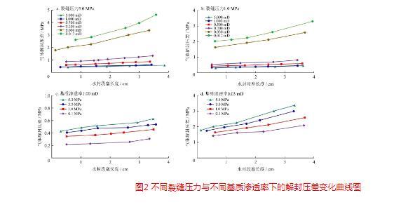 式中Δp表示解封壓差,MPa;Lw表示水封段塞長(zhǎng)度,cm;pf表示裂縫壓力,MPa;K表示基質(zhì)滲透率,mD。
