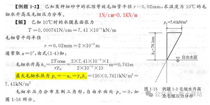 來自《土力學(xué)》式中,水膜張力T與溫度有關(guān),單位:N/cm或KN/m;10°時(shí),T=7.41×10-4N/cm=7.41×10-5KN/m;方向與毛細(xì)管成夾角α,該角度的大小與土顆粒礦物成分和水性質(zhì)有關(guān);