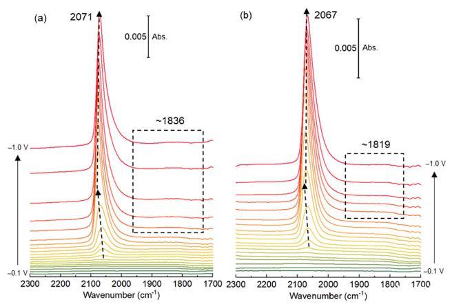 圖1. 在CO2飽和的0.1 M KHCO3/H2O電解質(zhì)中,(a)制備前銅薄膜和(b)陽極氧化銅薄膜在1700-2300 cm-1區(qū)域的原位SEIRAS光譜。0 V處的光譜用作背景。