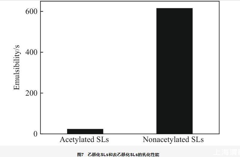 油-水界面膜的穩(wěn)定性是表面活性劑乳化能力的決定性因素。去乙?;疭Ls對(duì)液體石蠟等疏水性有機(jī)物的乳化性能是乙?;疭Ls的26.7倍(圖7)。由于去乙?;疭Ls含有豐富的羥基等親水基,增大SLs分子在油-水界面的水一側(cè)的穩(wěn)定性;另外,去乙?;疭Ls中含有更復(fù)雜的同系物組分,在對(duì)液體石蠟的乳化過(guò)程中具有協(xié)同作用。特別是bola型結(jié)構(gòu)的SLs在兩相界面之間能夠形成雙電子層,阻止油相之間的相互聚集,提高了乳液的穩(wěn)定性。