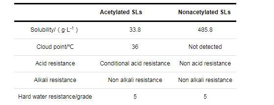 乙酰化SLs和去乙?;疭Ls的溶解性、濁點(diǎn)和耐酸堿性如表3所示,可以看出,去乙?;疭Ls在水中的溶解度達(dá)到485.8 g/L,較乙?;疭Ls提高了14倍以上。這是由于去乙酰化SLs中含有豐富的親水羥基,能夠與水分子形成穩(wěn)定的氫鍵。乙?;疭Ls濁點(diǎn)為36℃,可能限制其在高溫環(huán)境中的應(yīng)用;去乙?;疭Ls則無(wú)明顯濁點(diǎn),這是由于其組分中自由酸性和bola型SLs占絕對(duì)優(yōu)勢(shì),這2類糖脂組分的分子轉(zhuǎn)動(dòng)自由度高,使其不易結(jié)晶。另外,乙?;碧侵瑸橛袟l件的耐酸級(jí),但是為非耐堿級(jí);去乙?;疭Ls則為非耐酸堿級(jí),這可能是由于SLs的分子含有的β-糖苷鍵或羧酸基團(tuán)容易在酸堿條件下發(fā)生水解。2類SLs均具有良好的抗硬水性能,達(dá)到最高級(jí)5級(jí)。