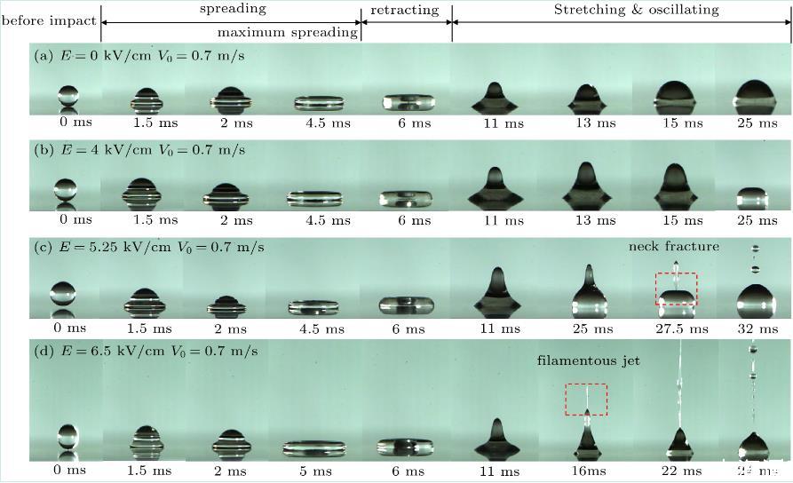 圖2去離子水在不同場強(qiáng)下撞擊親水表面的模態(tài)變化圖(We=17.8)