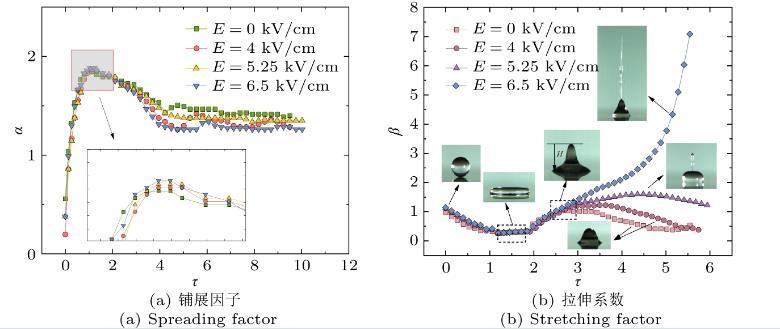 為了更詳細地研究垂直電場對液滴鋪展的影響,根據(jù)實驗獲得的連續(xù)照片分別測量了液滴演變過程中動態(tài)鋪展直徑L。圖3(a)描述了無電場和三種不同模式下液滴的鋪展因子α隨無量綱時間τ的變化。液滴撞擊后在短時間內(nèi)擴散并且?guī)缀跬瑫r達到最大鋪展狀態(tài),隨后液滴開始回縮,對應(yīng)的鋪展因子趨勢下降,最后進入液滴振蕩階段,由于液滴和表面的釘住作用,鋪展因子逐漸趨于穩(wěn)定。從圖3(a)可以看出,不同場強下的液滴在τ=1.19時達到最大鋪展,并且最大鋪展因子隨著電場強度的增加而小幅度增大,這是因為分布在液滴表面上的同類自由電荷之間的庫侖斥力會引入與表面張力相反方向的靜電力,額外的靜電力會減弱液體表面張力,進一步增強液滴的擴散。無電場與場強最大的液滴的最大鋪展因子相差小于2%,說明在液滴鋪展階段,電場力不是主導影響因素,這與前人的研究結(jié)果保持基本一致。