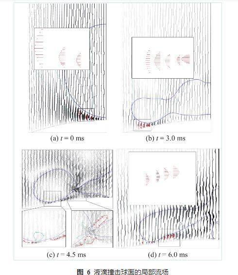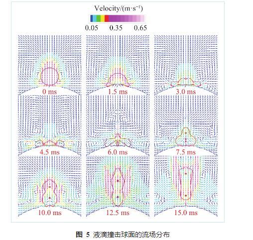 為了研究液滴撞擊高溫球面過(guò)程中液滴與氣膜的動(dòng)力學(xué)及傳熱學(xué)特性,以液滴撞擊623.15 K球面為例展開(kāi)模擬,液滴的撞擊速度為0.348 m/s,尺寸為d=1.61 mm,We=8.6.圖4展示了液滴撞擊過(guò)程中速度場(chǎng)、溫度場(chǎng)及壓力場(chǎng)的變化,圖5展示了液滴撞擊過(guò)程中流場(chǎng)的變化。