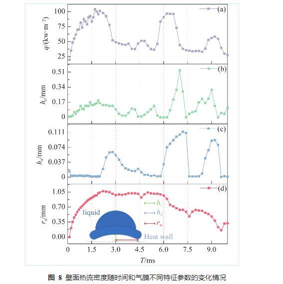 從圖7可以看出,相對(duì)于壓強(qiáng)的變化情況,壁面的熱流密度與氣膜的相關(guān)性更強(qiáng),氣膜厚度的變化會(huì)引起熱流密度的變化。圖8是液滴撞擊過(guò)程中壁面平均熱流密度及氣膜不同特征參數(shù)隨時(shí)間的變化情況,圖8(a)是壁面平均熱流密度,可以看出,平均熱流密度的變化情況受液滴中心氣膜厚度影響較大,在前期鋪展階段中心氣膜厚度出現(xiàn)明顯波動(dòng)時(shí)熱流密度也相應(yīng)波動(dòng),在液滴收縮階段,熱流密度變化明顯與頸部氣膜厚度成正相關(guān);圖8(b)是液滴中心氣膜高度,中心氣膜高度波動(dòng)最為劇烈,在液滴撞擊前3 ms內(nèi),即液滴鋪展階段先伴隨不穩(wěn)定波動(dòng)升高再保持穩(wěn)定,當(dāng)液滴開(kāi)始收縮時(shí)出現(xiàn)大范圍的波動(dòng);圖8(c)是液滴頸部氣膜厚度,頸部與中心點(diǎn)通常為液滴底部氣膜厚度最薄點(diǎn),也是熱流密度峰值點(diǎn);圖8(d)是液滴的頸部半徑長(zhǎng)度,它的變化規(guī)律與液滴鋪展情況相似,且可以用來(lái)表示液滴與壁面的有效換熱面積。相較其他兩項(xiàng)特征參數(shù)而言,液滴中心氣膜厚度顯然對(duì)熱力學(xué)能具有更高的影響。