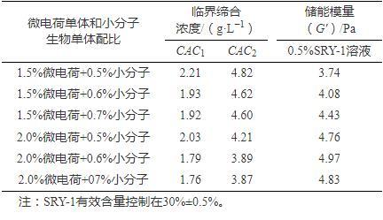 室內合成實驗研究發(fā)現(xiàn),微電荷單體對降低CAC2貢獻較大,用量優(yōu)選為1.5%~2.5%,而小分子生物單體對降低CAC1貢獻較大,用量優(yōu)選為0.5%~0.7%,兩種單體共同作用下臨界締合濃度降低和黏彈性提高顯著,最優(yōu)結果見表3??梢姰敳捎?.0%微電荷單體+0.6%小分子生物單體組合時,溶液具有較強的黏彈性,此時SRY-1的CAC1,CAC2分別為1.79 g·L?1、3.89 g·L?1,對應SRY-1用量接近0.18%、0.4%。