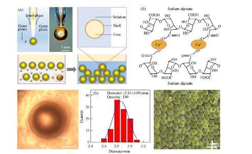 為了實現(xiàn)一步法制備大小均勻、尺寸可控、壁厚可調、生物相容的水/水微囊,需要設計同軸微流控器件,如圖1(A)所示。內相黃原膠水溶液由內管注入微流控器件;外相海藻酸鈉水溶液,由外管注入微流控器件。內相在外相的剪切下形成液滴,同時外相在重力作用下脫離管口生成水包水的水/水微囊,并進一步通過鈣離子交聯(lián)海藻酸鈉水凝膠網(wǎng)絡,如圖1(B)所示。由于微流控器件對內外相的精準調控,水/水微囊在光學顯微鏡下具有清晰穩(wěn)定的核殼結構圖1(C),平均尺寸(D)為(2.83±0.09)mm圖1(D)。該方法制備水/水微囊具有器件結構簡單、操作便捷、一步法成型、微囊尺寸均一可控、核殼結構穩(wěn)定、無需后處理等優(yōu)點圖1(E)。