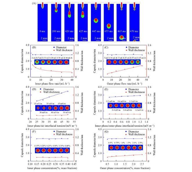 數(shù)值模擬與實驗結果具有較好的一致性,數(shù)值模擬內相/外相流速對水/水微囊直徑和壁厚的影響,得出了與實驗數(shù)據(jù)一致的規(guī)律,即水/水微囊的直徑基本不隨內相/外相流速的變化而變化,而水/水微囊壁厚隨內相流速增加或外相流速減小都將減小,如圖4(B)和(C)所示。與實驗相比,數(shù)值模擬可以更系統(tǒng)地調節(jié)各個參數(shù),如外相/空氣界面張力、內相/外相界面張力對微囊直徑和壁厚的影響。隨著外相/空氣界面張力的增加,水/水微囊直徑成比例增加,這是由于外相/空氣界面張力使微囊懸掛在管口,重力使微囊脫離管口,當外相/空氣界面張力增加,需要的重力相應增加,造成水/水微囊直徑增加。當內相/外相界面張力增大時,水/水微囊直徑略有增加。