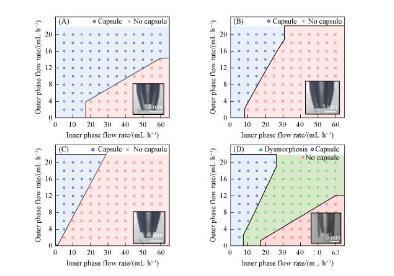 為了深入研究微流控器件結構對水/水微囊成型過程的影響規(guī)律,分別制備了內管管口內縮、內外管管口平齊、內管管口伸出、內管管口內縮外管管口不拉伸等4種同軸微流控器件,并通過系統(tǒng)改變內相和外相流速,判斷水/水微囊的成型情況,最終確定水/水微囊的制備相圖,分別如圖2(A)——(D)所示。水/水微囊形成的關鍵是內相在外相的剪切下形成液滴,同時外相在重力作用下脫離管口生成水/水微囊。由于內外相均是水溶液,內相/外相界面張力較小,并且流體黏度較大,內相不容易在外相的剪切下形成液滴,進而被外相包裹形成水/水微囊,因此外相流速增大,對內相剪切加強,更易形成水/水微囊。