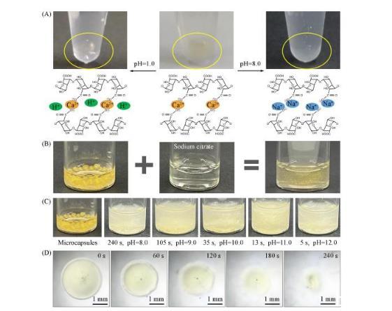 所制備的水/水微囊具有良好的生物相容性、尺寸均一性及較高的包裹率和裝載率,是各種活性物質(zhì)的理想載體,并且能夠?qū)H變化做出響應(yīng),實(shí)現(xiàn)可控釋放。如圖5(A)所示,水/水微囊的殼層是由二價(jià)鈣離子交聯(lián)的海藻酸鈉水凝膠組成,在酸性環(huán)境下具有良好的穩(wěn)定性,但在堿性環(huán)境下海藻酸鈉水凝膠與二價(jià)鈣離子的結(jié)合能力變?nèi)酰宦?lián)網(wǎng)絡(luò)被破壞,從而釋放內(nèi)核活性物質(zhì)。如果在溶液中加入檸檬酸鈉,二價(jià)鈣離子更傾向于與檸檬酸根結(jié)合,從而破壞交聯(lián)網(wǎng)絡(luò),也可以溶解水/水微囊。如圖5(C)所示,水/水微囊的溶解速率隨pH的增大而提高。當(dāng)水/水微囊的囊壁被溶解后,內(nèi)核物質(zhì)逐漸被釋放出來,展現(xiàn)出良好的pH響應(yīng)性和可控釋放。