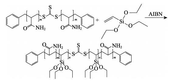 在500 mL四口燒瓶中加入300 g無水乙醇、0.0231 g(0.14 mmol)AIBN和10.0816 g(0.28 mmol)PAM-CTA-4,用超聲波將PAM-CTA-4混合均勻分散,再加入VTES〔其中,n(VTES)∶n(AM)=5∶100、10∶100、15∶100、20∶100〕,在70℃下反應(yīng)8 h。反應(yīng)結(jié)束后趁熱出料,過濾。在超聲條件下,用正己烷洗滌沉淀,過濾,重復(fù)數(shù)次,在45℃真空干燥24 h,得到PAM-b-PVTES固體粉末。將上述不同n(VTES)∶n(AM)制得的產(chǎn)物依次命名為PAM-b-PVTES-1、PAM-b-PVTES-2、PAM-b-PVTES-3、PAM-b-PVTES-4。