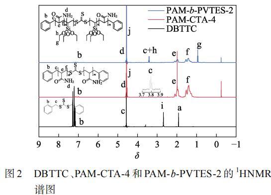 圖2為DBTTC、PAM-CTA-4和PAM-b-PVTES-2的1HNMR譜圖。如圖2所示,DBTTC的1HNMR譜圖曲線中δ=1.92(a)為氘代丙酮的質(zhì)子峰,δ=7.13~7.31(b)是苯環(huán)上的質(zhì)子峰;δ=4.56(c)的峰為亞甲基(—CH2—)的質(zhì)子峰;δ=2.62(i)為DBTTC樣品中含有的極少量H2O的質(zhì)子峰,可以確定成功合成了RAFT試劑DBTTC。PAM-CTA-4和PAM-b-PVTES-2的1HNMR譜圖曲線中,δ=4.80(j)為重水(D2O)的質(zhì)子峰;δ=7.27~7.48(b)是苯環(huán)上的質(zhì)子峰;δ=4.82(d)為酰胺基(—NH2)的質(zhì)子峰;δ=1.95~2.24(e)是主鏈上的次甲基(—CH—)的質(zhì)子峰;δ=1.31~1.66(f)是主鏈上的亞甲基(—CH2—)的質(zhì)子峰。在PAM-CTA-4曲線中,δ=3.78~3.82(c)為與苯環(huán)相連亞甲基的質(zhì)子峰。PAM-b-PVTES-2曲線中δ=3.39~3.43(c+h)為與苯環(huán)相連和乙烯基中的亞甲基(—CH2—)質(zhì)子峰;δ=0.93~0.95(g)為有機硅中甲基(—CH3)的質(zhì)子峰。通過FTIR譜圖和1HNMR譜圖可以確定合成了PAM-CTA-4和PAM-b-PVTES-2。