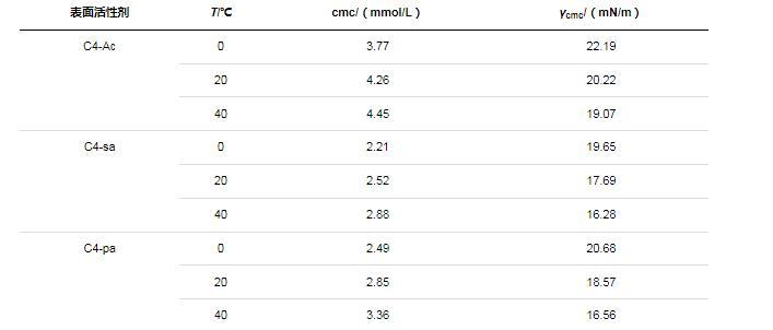 總體而言,溫度對甜菜堿氟碳表面活性劑的cmc影響較小。此外,在0~40℃的溫度范圍內(nèi),對比三種表面活性劑的表面活性參數(shù)可知,cmc值均小于4.45 mmol/L,γcmc均小于22.19 mN/m。親水端官能團的不同對表面活性劑的性能具有一定的影響,當(dāng)溶液濃度足夠大時,C4-Ac的表面張力相對較高,C4-sa和C4-pa具有較低的表面張力,后者略高于前者,并且C4-sa和C4-pa的cmc值低于C4-Ac。因為從分子結(jié)構(gòu)上來看,C4-Ac比C4-sa和C4-pa少一個有效碳,因此前者的疏水性要略弱于后二者,可以解釋表面張力和cmc的相對大小。