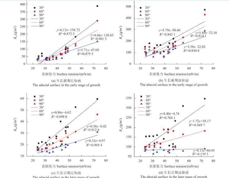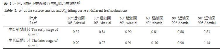 由表2結(jié)果可知,蘋(píng)果葉片生長(zhǎng)前期近、遠(yuǎn)軸面和生長(zhǎng)后期近軸面,不同葉傾角下表面張力與Rm值擬合曲線的R2均高于0.80。而蘋(píng)果葉片生長(zhǎng)后期遠(yuǎn)軸面除30°時(shí)R2高于0.7外,其他葉傾角下均低于0.6,且隨著葉傾角增大,R2不斷減小,這表明蘋(píng)果葉片生長(zhǎng)后期遠(yuǎn)軸面的表面張力與Rm值之間的線性關(guān)系較差。