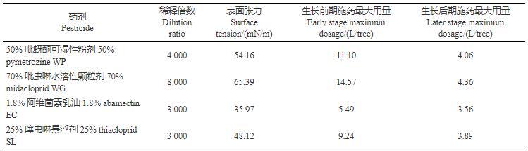 基于2.3節(jié)中表面張力與Rm值之間的關(guān)系,選取4種常用農(nóng)藥制劑(50%吡蚜酮可濕性粉劑、70%吡蟲(chóng)啉水溶性顆粒劑、1.8%阿維菌素乳油和25%噻蟲(chóng)嗪懸浮劑),測(cè)定其最大表面張力,結(jié)合果樹(shù)常用冠層參數(shù)(平均葉傾角、葉面積指數(shù)等)對(duì)果樹(shù)施藥用量進(jìn)行預(yù)測(cè)評(píng)估,從而為大容量果樹(shù)精準(zhǔn)用藥提供理論基礎(chǔ)。
