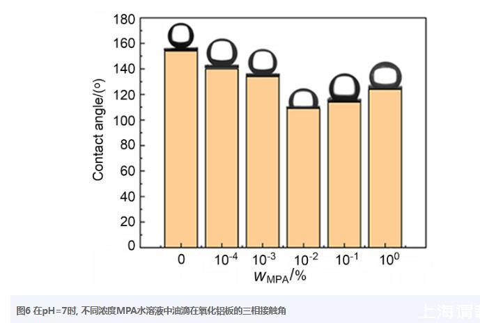 接觸角測量可以用來表征納米顆粒經(jīng)改性后的親疏水性。本研究是以氧化鋁板作為模擬納米氧化鋁的基材,研究癸烷油滴在不同MPA濃度的溶液中(pH=7)在氧化鋁板上的三相接觸角,如圖6所示。當(dāng)MPA濃度為0時,油滴與氧化鋁板的接觸角超過150°,說明氧化鋁在沒有MPA分子時具有較強的親水性。隨著MPA濃度逐漸增加,接觸角不斷降低,這是因為MPA濃度越高,在氧化鋁板上吸附的MPA分子越多,疏水性越強,油滴則可更容易吸附在界面上,當(dāng)MPA濃度為0.01%(w)時,接觸角降到最低(110°)。然而,當(dāng)進一步增加MPA濃度,接觸角反而逐漸升高,這是因為過多的Bola型分子結(jié)構(gòu)MPA使親水性反而增加。該結(jié)果與Zeta電勢的結(jié)果趨勢類似,可以進一步印證了MPA分子吸附在了納米Al2O3顆粒表面上。