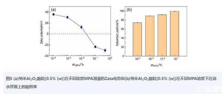 圖5(a)納米Al2O3顆粒【0.5%(w)】在不同濃度MPA溶液的Zata電勢和(b)納米Al2O3顆?!?.5%(w)】在不同MPA濃度下在油水界面上的吸附率