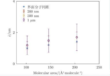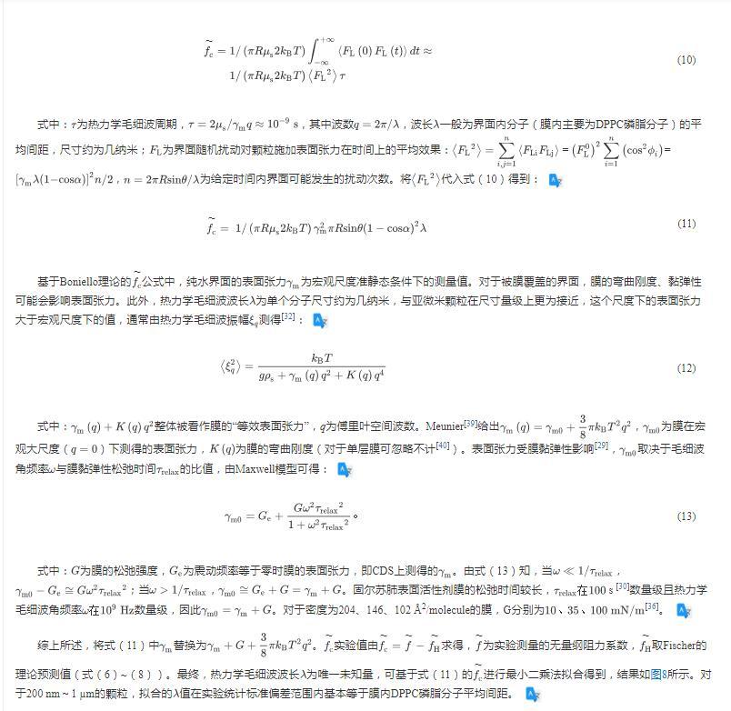 公式中,純水界面的表面張力為宏觀尺度準(zhǔn)靜態(tài)條件下的測(cè)量值。對(duì)于被膜覆蓋的界面,膜的彎曲剛度、黏彈性可能會(huì)影響表面張力。此外,熱力學(xué)毛細(xì)波波長(zhǎng)為單個(gè)分子尺寸約為幾納米,與亞微米顆粒在尺寸量級(jí)上更為接近,這個(gè)尺度下的表面張力大于宏觀尺度下的值,通常由熱力學(xué)毛細(xì)波振幅測(cè)得: