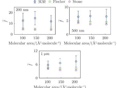 2)在LE相表面結(jié)構(gòu)均勻的膜上,顆粒阻力系數(shù)等于水動(dòng)力學(xué)阻力系數(shù)與熱力學(xué)毛細(xì)波界面擾動(dòng)表面張力阻力系數(shù)之和。其中,界面擾動(dòng)表面張力需體現(xiàn)膜的黏彈性及微納尺度,因此加入了黏彈性項(xiàng)以及熱力學(xué)毛細(xì)波波數(shù)項(xiàng)。利用熱力學(xué)毛細(xì)波波長(zhǎng)擬合實(shí)驗(yàn)測(cè)量值發(fā)現(xiàn),約等于膜內(nèi)主要成分DPPC磷脂分子的平均間距,符合熱力學(xué)界面擾動(dòng)的理論描述。