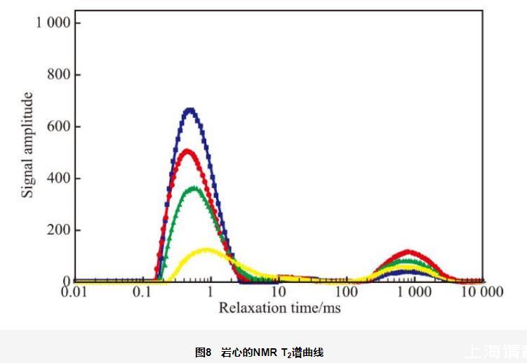 通過核磁共振儀可測(cè)量巖心自發(fā)滲吸實(shí)驗(yàn)中流體賦存狀態(tài)。圖8為經(jīng)不同方法處理的巖心的NMR T2譜曲線。由圖8可知,每條T2譜曲線都出現(xiàn)兩個(gè)峰,左峰的信號(hào)強(qiáng)度均強(qiáng)于右峰,表明水/油主要賦存在小孔喉中。這是因?yàn)槊?xì)管半徑越小,對(duì)應(yīng)的自吸毛細(xì)管力越強(qiáng),流體通過自吸進(jìn)入巖心孔隙后,在毛細(xì)管力的作用下,大孔隙內(nèi)的流體會(huì)進(jìn)一步自吸進(jìn)入較小孔隙,因此,巖心的流體優(yōu)先賦存在較小孔隙。經(jīng)復(fù)合表面活性劑體系處理后的T2譜曲線低于未經(jīng)處理的T2譜曲線,表明經(jīng)復(fù)合表面活性劑體系處理后的巖心含水/油飽和度低于未經(jīng)處理的巖心含水/油飽和度。表征結(jié)果再次證明自發(fā)滲吸實(shí)驗(yàn)中的復(fù)合表面活性劑體系通過表面張力降低和疏水疏油改性可預(yù)防液侵傷害。