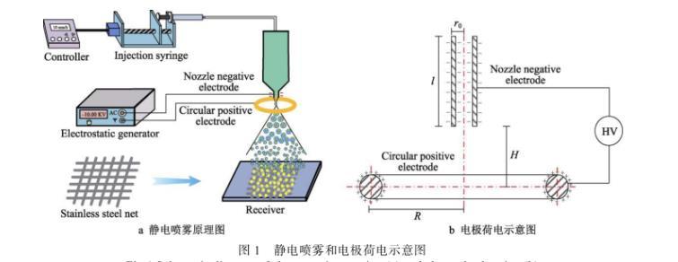 靜電噴霧裝置主要由高壓靜電發(fā)生器、控制器、微量注射器、噴嘴電極、環(huán)形電極和接收板組成,如圖1a所示。噴嘴電極連接高壓靜電發(fā)生器的負(fù)極,環(huán)形電極接高壓靜電發(fā)生器的正極。高壓靜電發(fā)生器輸出負(fù)高壓,在噴嘴電極會產(chǎn)生大量的負(fù)電荷,同時(shí)環(huán)形電極上會感應(yīng)出正電荷。調(diào)節(jié)靜電發(fā)生器的參數(shù),控制噴嘴電極和環(huán)形電極之間的電場強(qiáng)度。將微量注射泵固定在支架上,使用微量注射泵將溶液勻速泵送到噴嘴處。液體從噴嘴噴出時(shí)與高壓電極接觸,使電極上的電荷傳導(dǎo)到液體。帶電液體在靜電力、電荷互斥力、重力、環(huán)境復(fù)合力的作用下,破碎成細(xì)小液滴,并均勻地吸附在工件上。