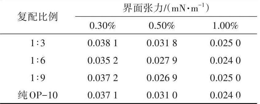 將HPAM配制成質(zhì)量分?jǐn)?shù)為0.10%的水溶液,與不同濃度的OP-10按不同比例復(fù)配,并測定不同復(fù)配體系的界面活性,結(jié)果見表3。