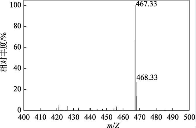 圖4為TAC的MS譜圖。從圖4可以看出,在正離子檢測(cè)模式下檢測(cè)到最大豐度的質(zhì)譜信號(hào)為m/Z=467.33,m/Z=468.33為[M+1],即正峰MS信號(hào)。TAC相對(duì)分子質(zhì)量測(cè)量值與計(jì)算值一致。