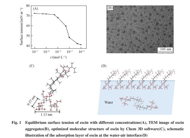 首先,采用吊片法測(cè)量了不同濃度七葉皂素溶液的表面張力.由于七葉皂素溶解度的限制,當(dāng)濃度超過(guò)1×10-3mol/L時(shí)會(huì)有少量固體物質(zhì)析出,影響測(cè)試結(jié)果,故表面活性測(cè)試的濃度范圍為1×10-7~1×10-3mol/L.如圖1(A)所示,隨著七葉皂素濃度的增加,表面張力呈現(xiàn)先基本不變、后快速下降、最后達(dá)到平衡的3個(gè)階段.這是由于濃度低于1×10-5mol/L時(shí),只有少量七葉皂素分子吸附在氣-液界面,表面張力基本不變;然后隨著濃度增加,越來(lái)越多的分子遷移并吸附在氣-液界面,使溶液表面張力快速下降;當(dāng)分子在界面吸附達(dá)到飽和(5×10-4mol/L)后,開(kāi)始在體相聚集形成膠束,表面張力不再改變.可知,七葉皂素的臨界膠束濃度(cmc)為5×10-4mol/L,對(duì)應(yīng)的表面張力(γcmc)為42.1 mN/m.圖1(B)為七葉皂素形成聚集體的TEM照片,膠束大小約為20 nm.