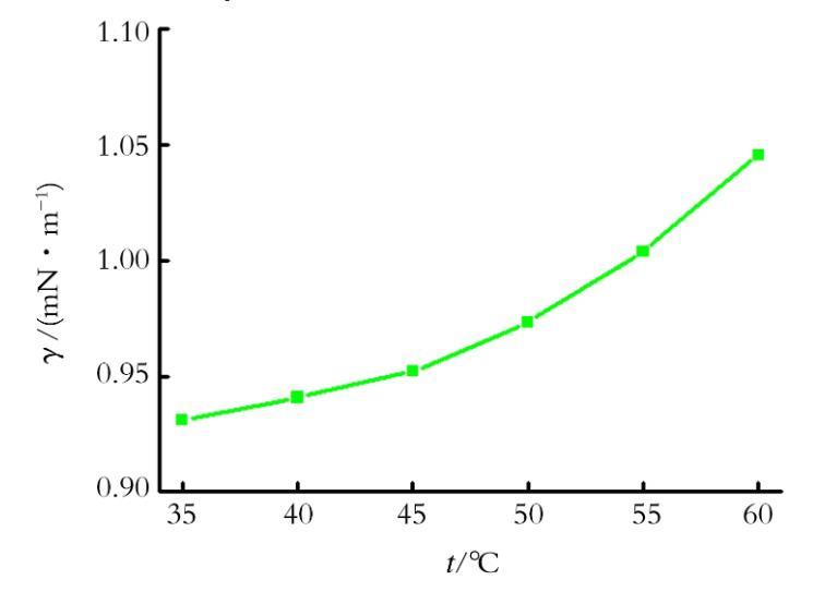 由圖3可見(jiàn),溫度對(duì)腰果酚醛樹(shù)脂嵌段聚醚破乳劑的界面活性有較大的影響,油-水界面張力隨著溫度的升高而增大,且油-水界面張力增大的幅度隨著溫度的升高而增大,從35℃升高至40℃時(shí),體系油-水界面張力升高了0.01 mN/m,但從55℃升高至60℃時(shí),體系油-水界面張力卻升高了0.04 mN/m。以上實(shí)驗(yàn)結(jié)果表明,溫度升高,表面活性劑分子與水分子之間的氫鍵變?nèi)酰H合力減小,致使表面活性劑的溶解性下降;此外,表面活性劑分子在油水界面上的吸附速度小于解吸速度,使得界面上的分子數(shù)量減小,界面張力增大,破乳效果變差。因此,該破乳劑適合在低溫環(huán)境下使用。