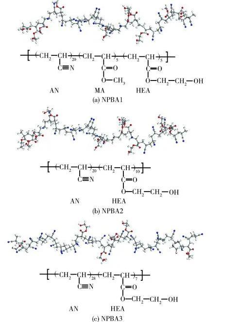 利用美國Accelrys公司Materials Studio軟件建立NPBA分子模型時,NPBA1聚合單元AN、MA和HEA的數(shù)目分別為20、5和5,NPBA2聚合單元AN和HEA的數(shù)目分別為20和10,NPBA3聚合單元AN和HEA的數(shù)目分別為28和7,NPBA分子模型上各類聚合單元均為隨機分布。此時3種NPBA分子模型的摩爾鏈節(jié)比分別為4∶1∶1、2∶1和4∶1,且相對分子質(zhì)量均為2 300左右,使得所構(gòu)建的模型與實際物質(zhì)具有較好的對應(yīng)關(guān)系。