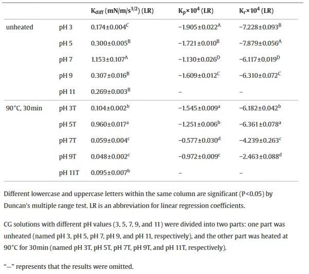 Kdiff、Kp和Kr的最高值分別為pH值7、3和5。柔性蛋白可以在油水界面上更快地吸附和重新排列。pH為3時(shí)CG靈活的二級(jí)結(jié)構(gòu),使其具有更好的吸附動(dòng)力學(xué),。pH 5(接近pI 4.3)的CG更弱的靜電斥力,引起了更好的結(jié)構(gòu)重排。加熱后,除pH值為5時(shí)CG的Kdiff外,所有樣品的Kdiff、Kp和Kr均有所下降。加熱后的CG具有較低的初始界面張力和較短的平衡吸附時(shí)間(圖1a),它能迅速達(dá)到平衡狀態(tài),并且吸附動(dòng)力學(xué)指數(shù)較低。此外,加熱后的CG表現(xiàn)出顯著的變性和聚集,殘留的蛋白質(zhì)分子會(huì)產(chǎn)生空間位阻,從而阻礙聚集后的CG到達(dá)油水界面。此外,不溶性CG聚集體對(duì)殘留CG分子的吸附產(chǎn)生了屏障。CG在pH為5時(shí),蛋白質(zhì)形成大量沉淀,溶解度僅為12.05%??扇苄缘鞍缀康鸵馕吨^弱的靜電排斥力,這使剩余的蛋白更容易擴(kuò)散,從而導(dǎo)致最高的Kdiff。與動(dòng)態(tài)界面張力相比,CG與pH 5T的吸附動(dòng)力學(xué)不受蛋白質(zhì)濃度的影響。