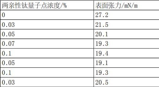 按照100%計(jì),由以下重量含量的原料組成:兩親性鈦量子點(diǎn)0.03-0.1%,兩性表面活性劑0.2-0.4%,陰-非離子表面活性劑0.05-0.2%,助溶劑0.1-0.2%,抑泡劑0.1-0.3%,余量的水;其中,所述兩親性鈦量子點(diǎn)是通過以下方法制備得到的:先通過水熱法將鈦酸酯類偶聯(lián)劑水解并縮合形成鈦基量子點(diǎn),再通過硅烷偶聯(lián)劑進(jìn)行一次改性,隨后利用功能單體進(jìn)行二次表面原位聚合改性,所述功能單體為疏水單體、丙烯酸和耐溫耐鹽單體。
