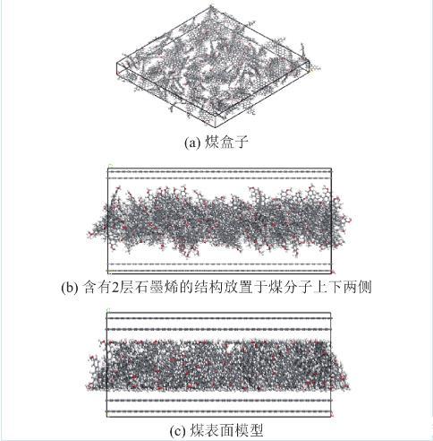 采用Materials studio分子動力學(xué)軟件中的Amorphous Cell功能,建立一個由150個wender無煙煤分子組成的煤盒子(圖10a),煤盒子的長和寬均為10 nm;然后創(chuàng)建一個與煤盒子等長/等寬的含有2層石墨烯的結(jié)構(gòu),通過Build layers功能將含有2層石墨烯的結(jié)構(gòu)放置于煤分子上下兩側(cè)(圖10b);最后,通過不斷的壓縮、移動及結(jié)構(gòu)優(yōu)化操作,將上下兩側(cè)的石墨烯結(jié)構(gòu)刪除,獲得平整的煤表面模型(圖10c)。