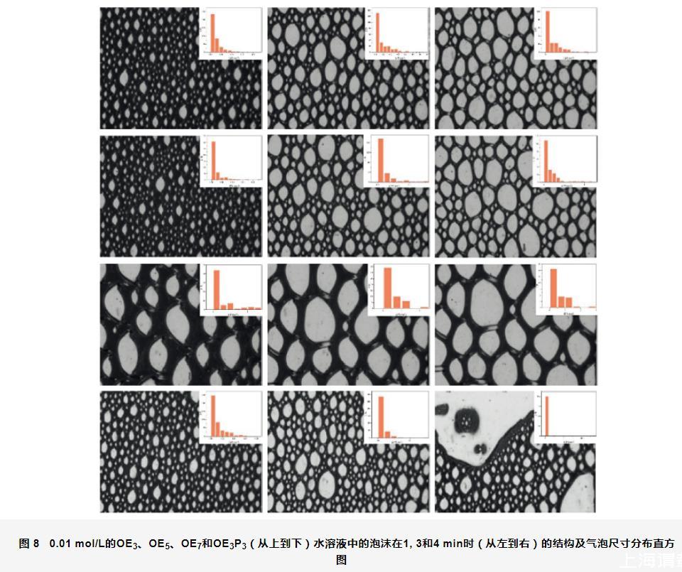 圖8 0.01 mol/L的OE3、OE5、OE7和OE3P3(從上到下)水溶液中的泡沫在1,3和4 min時(從左到右)的結(jié)構(gòu)及氣泡尺寸分布直方圖