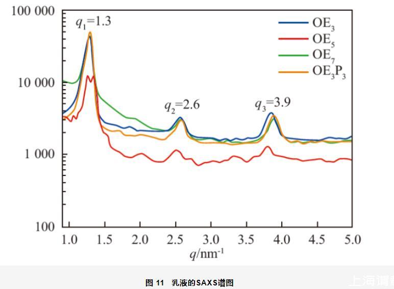 對乳液進(jìn)行了SAXS測試,結(jié)果如圖11所示。由圖可知,4種乳液的SAXS譜圖中都出現(xiàn)了3組衍射峰,且q1∶q2∶q3滿足1∶2∶3,進(jìn)一步證明了乳液的層狀液晶結(jié)構(gòu),q2處明顯的衍射峰表明液晶結(jié)構(gòu)的長程有序,使乳液不容易發(fā)生結(jié)塊或絮凝等,起到穩(wěn)定乳液的作用。另外,以O(shè)E5為乳化劑制備的乳液的SAXS譜圖中出現(xiàn)了很多毛刺,說明樣品的有序性較差。