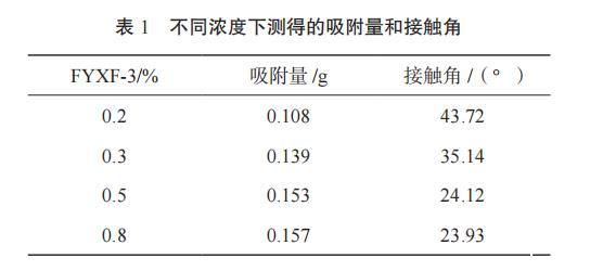 水與韓城煤粉的接觸角為73.23°。在不同濃度下測懸浮劑吸附量和接觸角,結(jié)果見表1。由表1可以看出,添加FYXF-3后,能大幅度地降低接觸角,接觸角隨著FYXF-3濃度的增大而減小,濃度大于0.5%后,減小幅度變小;吸附量隨著濃度的增大而增大,濃度大于0.5%后,增大的幅度變小。這說明FYXF-3濃度不小于0.5%時,能較大地增加吸附量、減小接觸角,從而能有效改善煤粉表面的潤濕性能,防止分散的煤粉結(jié)塊而產(chǎn)生沉降,這樣有利于懸浮煤粉并將其返排。