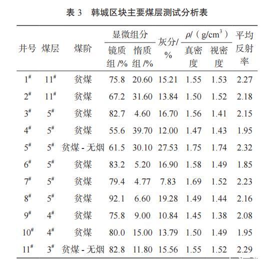 表3韓城區(qū)塊主要煤層測(cè)試分析表