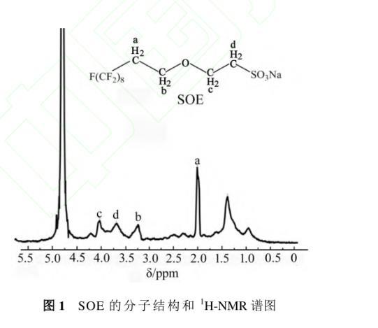 SOE的分子結構和1H-NMR(D2O,400 MHz)譜圖如圖1所示。圖中SOE分子中所有氫的化學位移δ(ppm)如下:δa=2.02和δb=3.25分別為—CH2CH2O—中氫的化學位移,δc=4.03和δd=3.68分別為與磺酸離子直接相連的—CH2CH2—中氫的化學位移。溶劑(D2O)中殘余氫的δ為4.79。1H-NMR的表征結果說明樣品為目標產(chǎn)物。
