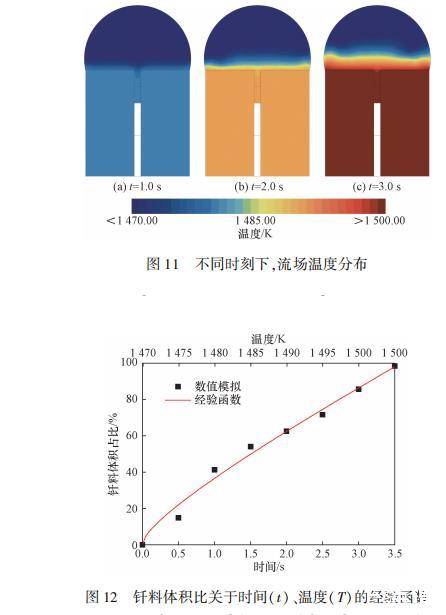 圖11給出了不同時(shí)刻下的流場(chǎng)溫度分布。不同時(shí)刻下的釬料頂端的溫度場(chǎng)幾乎沒(méi)有變化,這是因?yàn)橥獠坑?jì)算區(qū)域內(nèi)充滿(mǎn)空氣,釬料與空氣之間的熱效率遠(yuǎn)低于釬料和母材之間,故空氣對(duì)釬料的溫度控制影響是微乎其微的。釬料底部溫度隨著母材升溫迅速上升,由于相變潛熱的存在,使得上方釬料溫度分布始終保持在熔點(diǎn)以下(1470.0K)。