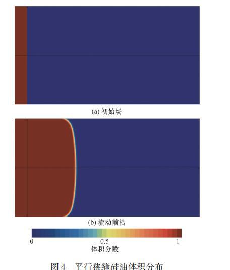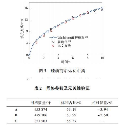 根據(jù)式(6)與式(7)可以看出,這類(lèi)由表面張力驅(qū)動(dòng)的流動(dòng)與邊界處接觸角緊密相關(guān)。為保證接觸角施加方法的正確性,對(duì)表面張力驅(qū)動(dòng)下的平行平板流動(dòng)進(jìn)行了計(jì)算,并將結(jié)果與前人的數(shù)值模擬結(jié)果進(jìn)行了對(duì)比。驗(yàn)證模型為15mm×8mm×0.4mm的平行平板,所采用材料為硅油,具體物性參數(shù)如表1所示。首先將平板前端部分區(qū)域內(nèi)充滿(mǎn)硅油,以此為初始場(chǎng)進(jìn)行計(jì)算[圖4(a)]。圖4(b)為計(jì)算一段時(shí)間后得到的流動(dòng)前沿,最終得到的前沿最大高度隨時(shí)間變化如圖5所示,計(jì)算結(jié)果與前人數(shù)值模擬結(jié)果及Washburn解析模型吻合良好,證明了基于VOF模型的數(shù)值方法計(jì)算硅油填充平板過(guò)程的準(zhǔn)確性。