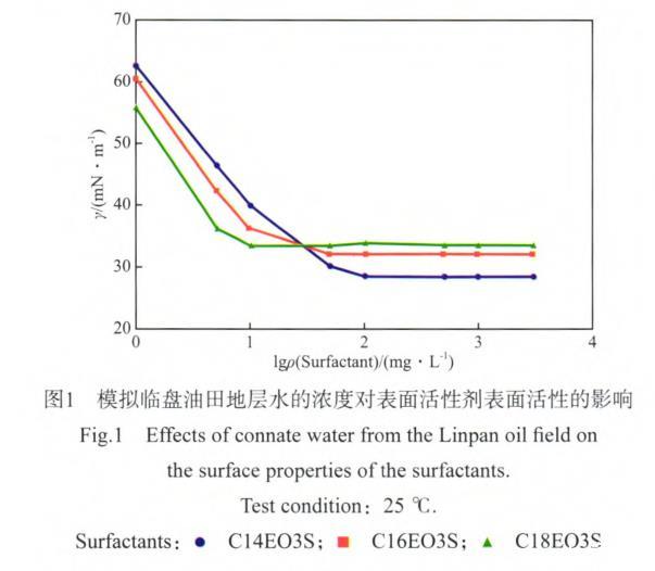 2)C14EO3S,C16EO3S,C18EO3S在蒸餾水中的cmc值分別為100,50,10 mg/L,其所對應(yīng)的γcmc分別為29.12,33.86,34.59 mN/m;在模擬臨盤油田地層水中的cmc值依次為80,40,10 mg/L,其所對應(yīng)的γcmc分別為28.86,32.38,33.75 mN/m。當(dāng)疏水基鏈長相同時,隨EO數(shù)的增加,脂肪醇聚氧乙烯醚磺酸鹽表面活性劑的cmc和其所對應(yīng)的γcmc均呈增大趨勢。