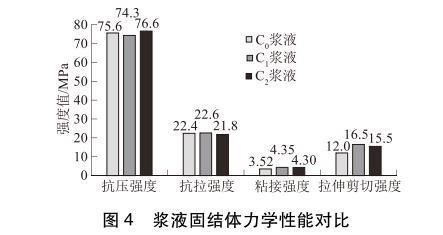 3種漿液固結體力學性能對比見圖4。由圖4可以看出:3種漿液固結體抗壓強度和抗拉強度數(shù)值差別不大,說明表面活性劑對漿液固結體的抗壓強度和抗拉強度無影響。但C1、C2漿液的粘接強度和拉伸剪切強度明顯高于C0漿液的粘接強度和拉伸剪切強度。其中C1漿液的粘接強度和拉伸剪切強度比C0漿液分別提高了23.6%和37.5%;C2漿液的粘接強度和拉伸剪切強度比C0漿液分別提高了22.2%和29.2%。其原因在于表面活性劑的加入降低了漿液的接觸角,使?jié){液有更好的浸潤性和潤濕性,從而提高了漿液的粘接強度和拉伸剪切強度。