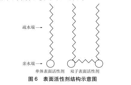從圖3中可以看出加入表面活性劑S1、S2能降低漿液的表面張力和接觸角。這是因為本次漿液改性選用的表面活性劑S1、S2從化學結構上屬于雙子型非離子表面活性劑。傳統(tǒng)表面活性劑和雙子型表面活性劑結構示意圖如圖6所示。