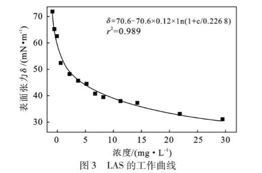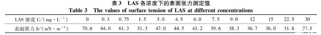 LAS是應用最廣泛的陰離子表面活性劑,是我國合成洗滌劑活性物的主要構(gòu)成,可用作洗衣粉、香波、金屬清洗劑、脫墨劑等產(chǎn)品的原料,分析其生物降解性能十分必要。LAS試樣在不同濃度時測定的表面張力結(jié)果見表3。