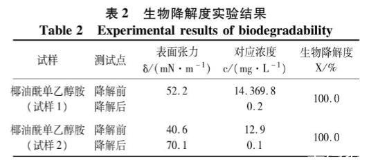 不同批次的椰油酰單乙醇胺試樣經(jīng)過降解后利用表面張力法測定其降解液的表面張力值,根據(jù)生物降解度公式計算得出降解度,測定結(jié)果見表2。其中空白降解試驗液降解前與降解后的表面張力值分別是69.5、68.2mN/m,而試樣溶液在降解后測定的表面張力值均大于空白降解試驗液降解后的表面張力值68.2mN/m,導致帶人工作曲線計算出的降解后試樣溶液的濃度(c終)小于降解后空白降解試驗液的濃度(c空),根據(jù)公式要求,當c終小于C空時,差值以零計,因此最終計算出的生物降解度為100.0%。