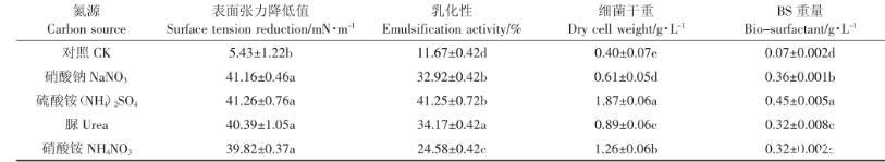 細胞表面的物質(zhì)合成需要氮源,氮源的種類會對細菌細胞的生長和發(fā)酵產(chǎn)物的產(chǎn)量產(chǎn)生很大影響。由表4可以看出,不同氮源對細菌發(fā)酵過程中表面張力降低值的影響較小,可能與發(fā)酵液中的生物表面活性劑含量已經(jīng)達臨界膠束濃度(CMC)有關(guān)。當?shù)礊榱蛩徜@時發(fā)酵液表面張力降低值最大,同時乳化性、細菌干重、糖脂含量均達到最大值。這與錢曉勇等研究結(jié)果一致,硫酸銨是促進生物表面活性劑生成的較好氮源。