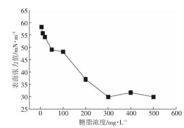 發(fā)酵產(chǎn)物臨界膠束濃度是指分子在溶劑中締合形成膠束的最低濃度。臨界膠束濃度(Critical micelle0.005 concentration,CMC)可以作為表面活性劑表面活性的一種度量,CMC越小,改變表/界面性質(zhì),起到增溶、乳化等所需的濃度就越低。從圖3可以看出:糖脂在0~300 mg·L-1時,表面張力值隨著糖脂濃度的升高而降低,且在300 mg·L-1時達到最小值;在300~500 mg·L-1時,表面張力值變化不大??傻冒l(fā)酵粗提產(chǎn)物的CMC為300 mg·L-1,明顯低于普通化學表面活性劑十二烷基磺酸鈉(SDS)的2200 mg·L-1,能在較低濃度下使用,因而在醫(yī)藥、食品、化工等行業(yè)具有廣闊應(yīng)用前景。